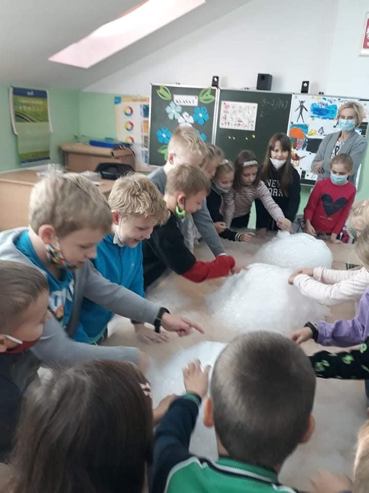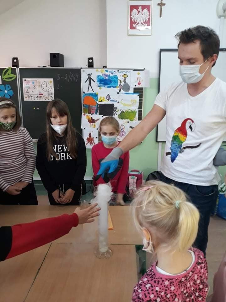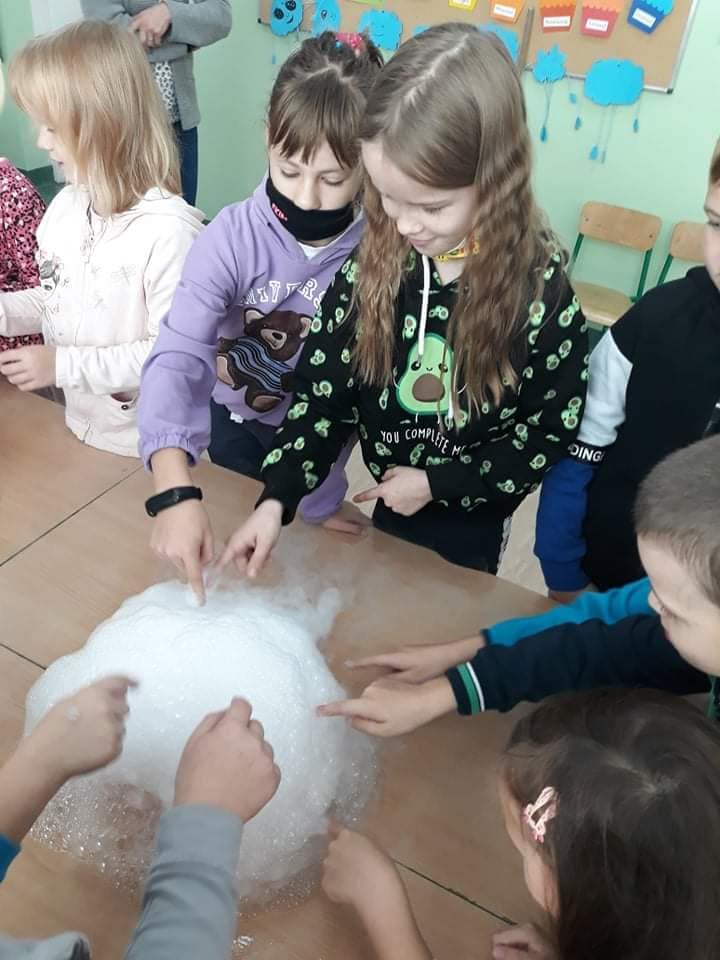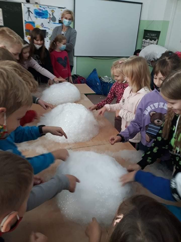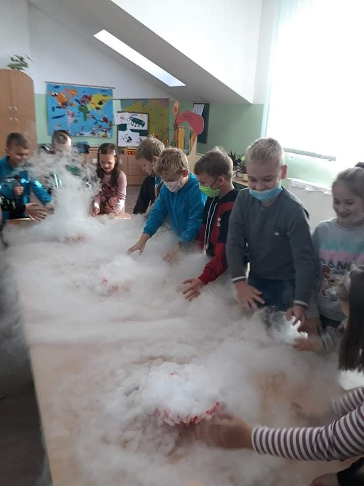Dzieci byly bardzo zainteresowane i zadowolone. Obserwowały i wykonywały doswiadczenia z suchym lodem, parą wodną , tworzyly potwora z piany, pisały znikajacym ołówkiem. Warsztaty pełne wrażeń !