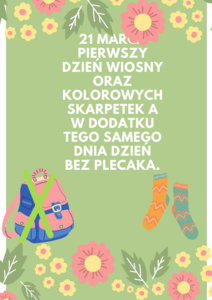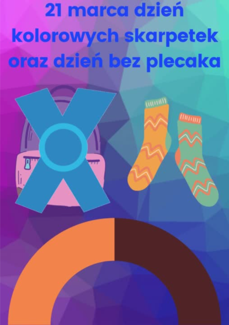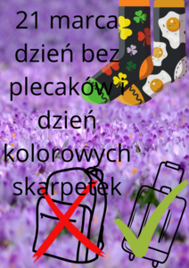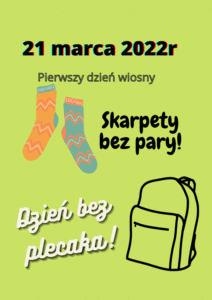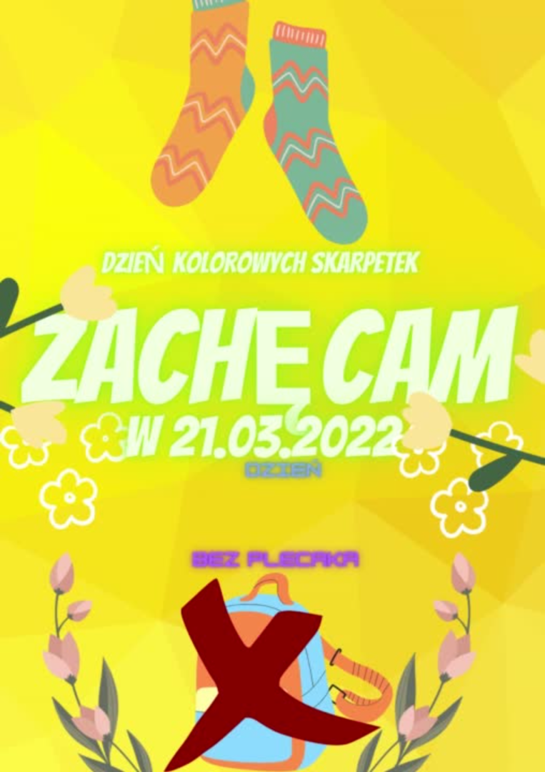 21 marca 2022r. rozpoczyna się kalendarzowa wiosna. W tym dniu w naszej szkole obchodzić będziemy "Dzień Kolorowej Skarpetki" - Światowy Dzień Osób z Zespołem Downa. Dodatkowo z inicjatywy Samorządu Uczniowskiego dzień 21 marca będzie dniem bez plecaka - potrzebna wasza kreatywność - w co zapakować książki?