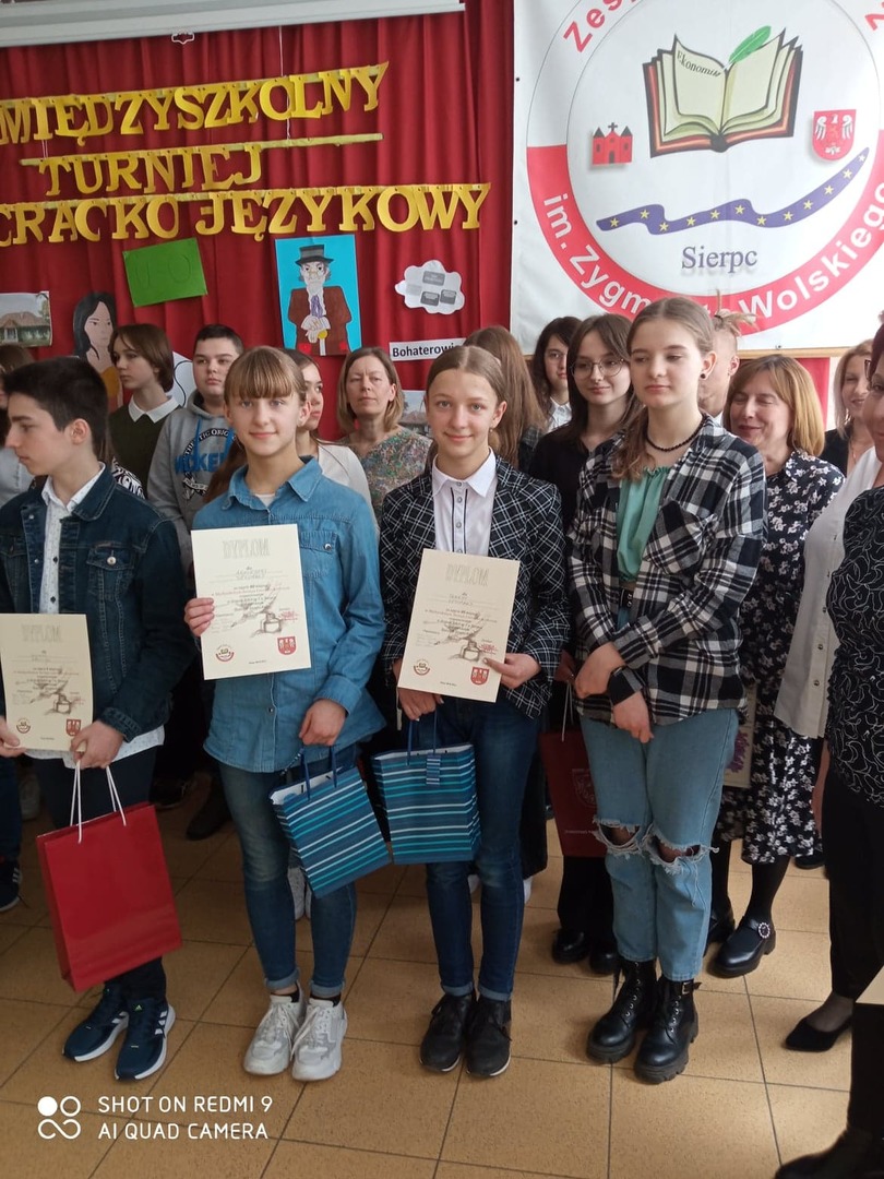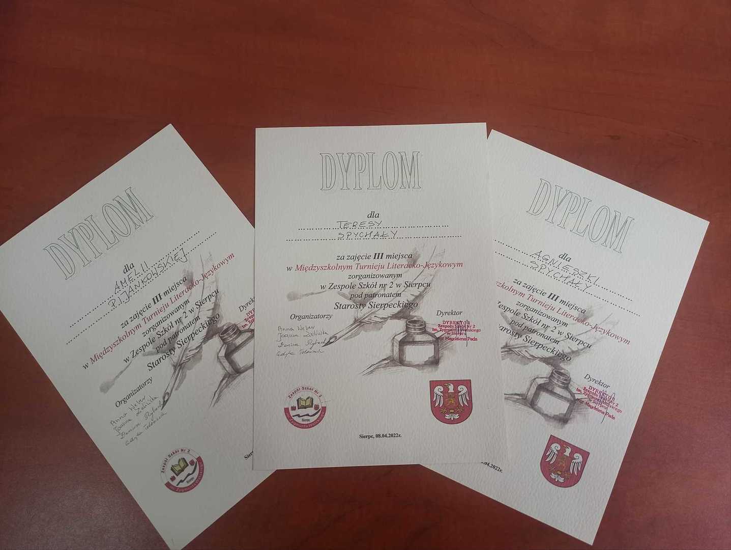 Miło nam poinformować,że trzy uczennice klasy 8, Amelia Pijankowska, Teresa Spychała i Agnieszka Spychała, zostały laureatkami III miejsca w Międzyszkolnym Konkursie Literacko- Językowym zorganizowanym przez Zespół Szkół nr 2 w Sierpcu. Konkurencje konkursowe wymagały dobrej znajomości zagadnień z zakresu nauki o języku , literatury oraz umiejętności recytatorskich i aktorskich. Dziewczynkom serdecznie gratulujemy.![]()