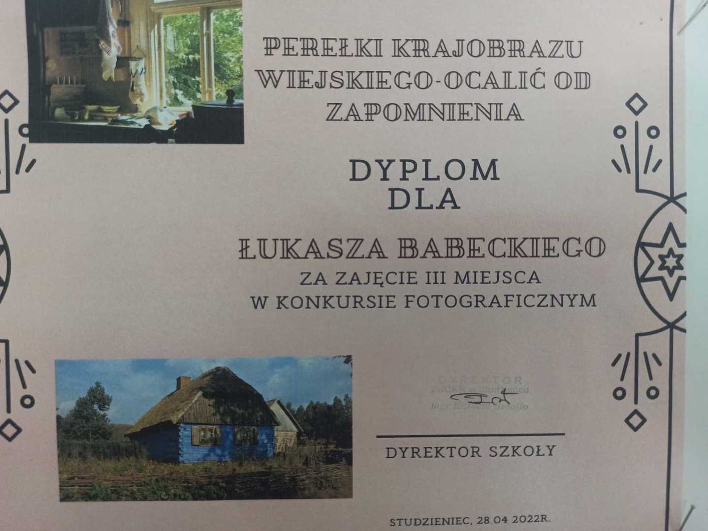 Konkurs fotograficzny "Perełki krajobrazu wiejskiego - ocalić od zapomnienia" organizowany przez ZSCKR w StudzieńcuIII miejsce Łukasz Babecki Klasa VII