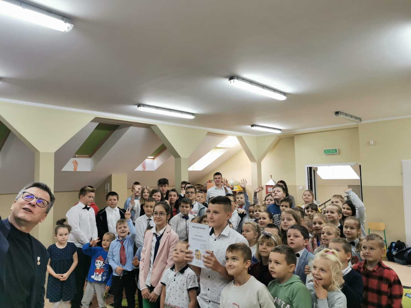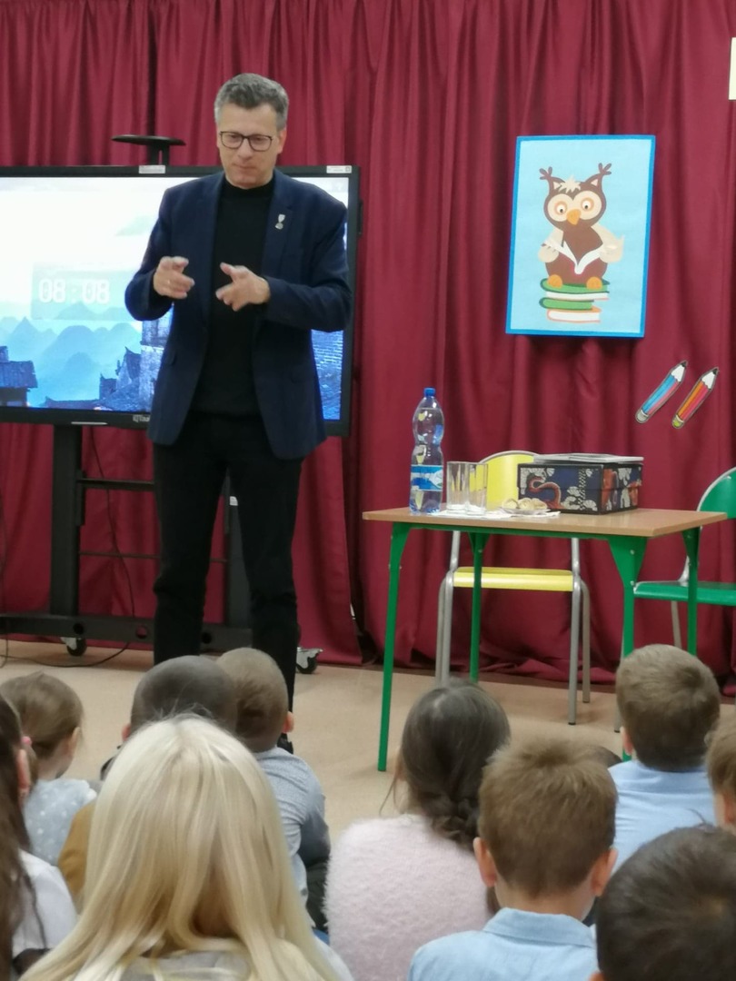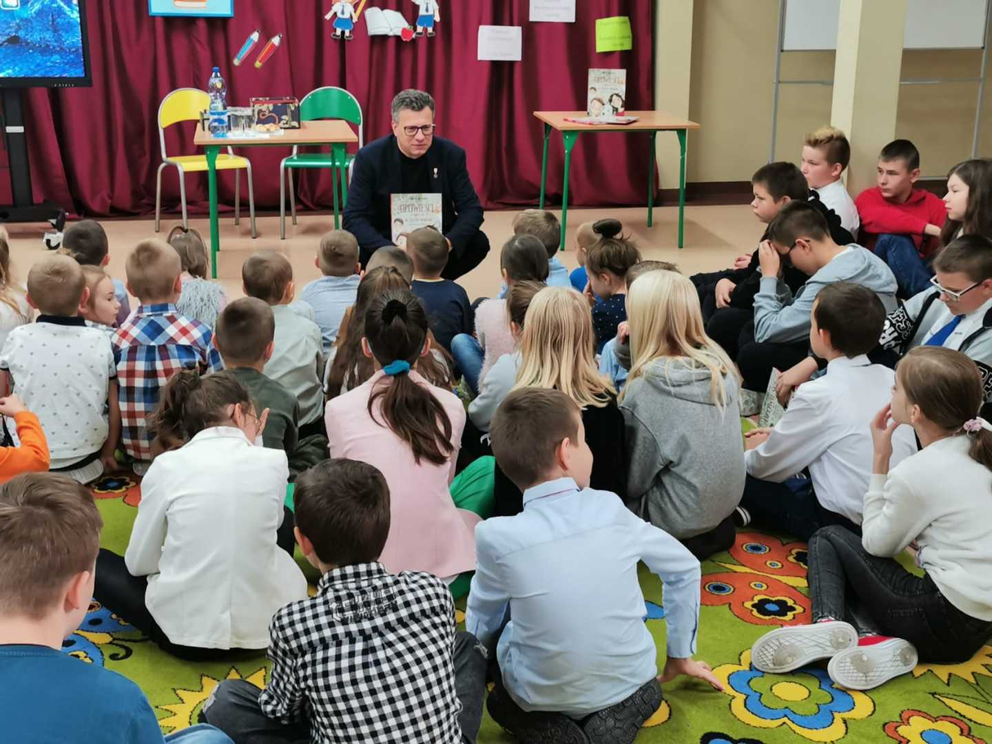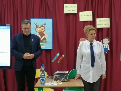 30 września 2022r. mieliśmy ogromną przyjemność gościć u nas Pana Marka Michalaka - pedagoga, byłego Rzecznika Praw Dziecka, Kawalera Orderu Uśmiechu i autora książek dla dzieci. Nasz gość ciekawie opowiadał o pracy pisarza, o swoich inspiracjach, pomysłach i planach na przyszłość. Chętnie odpowiadał na pytania uczniów. Dzieci z uwagą wysłuchały jednego z opowiadań ze zbioru "Opowieści o tym, co w życiu ważne", dostały także autografy autora we własnych egzemplarzach książki.