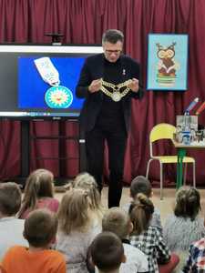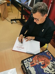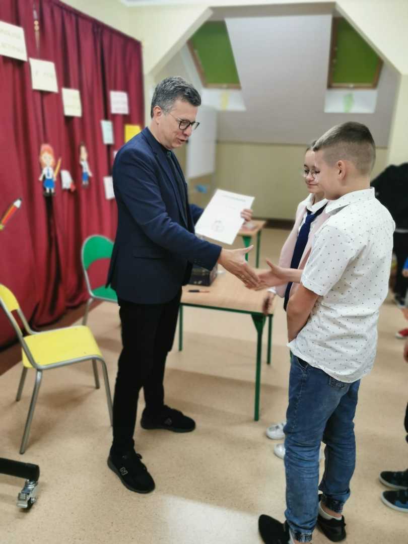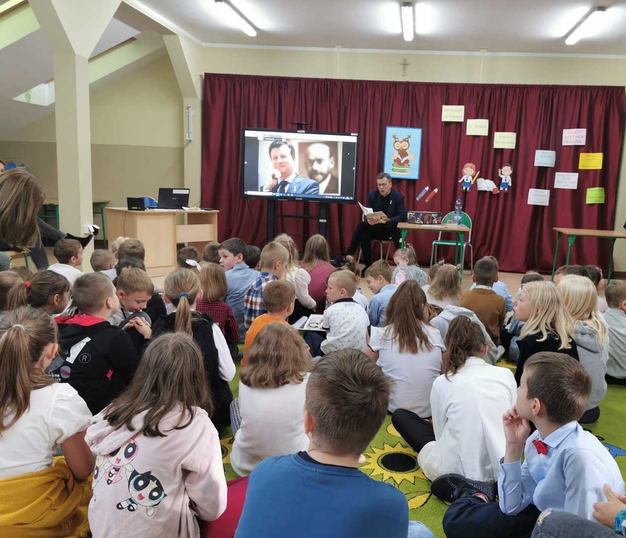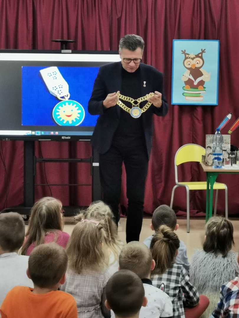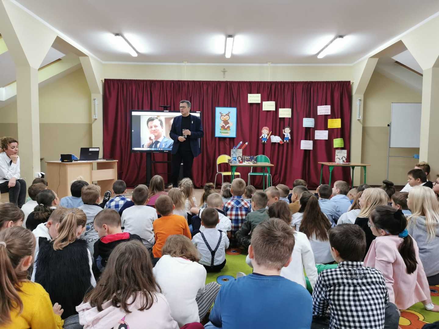 30 września 2022r. mieliśmy ogromną przyjemność gościć u nas Pana Marka Michalaka - pedagoga, byłego Rzecznika Praw Dziecka, Kawalera Orderu Uśmiechu i autora książek dla dzieci. Nasz gość ciekawie opowiadał o pracy pisarza, o swoich inspiracjach, pomysłach i planach na przyszłość. Chętnie odpowiadał na pytania uczniów. Dzieci z uwagą wysłuchały jednego z opowiadań ze zbioru "Opowieści o tym, co w życiu ważne", dostały także autografy autora we własnych egzemplarzach książki.