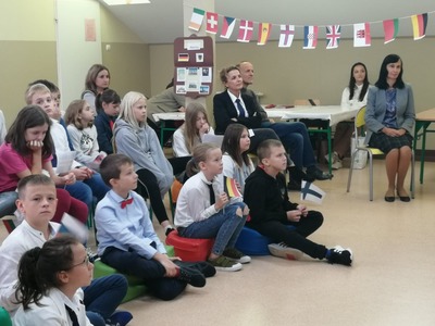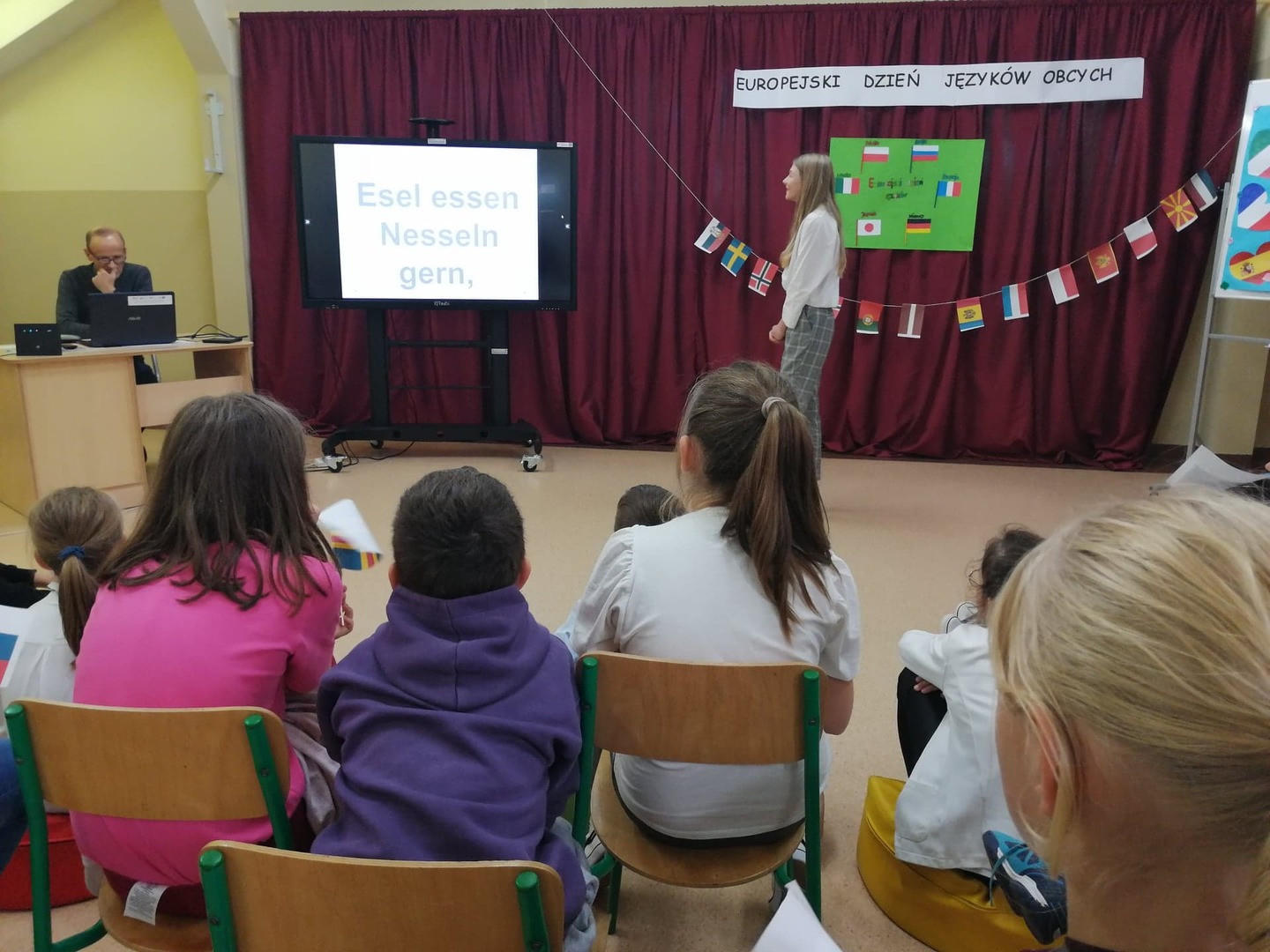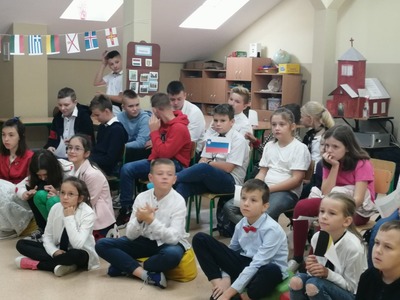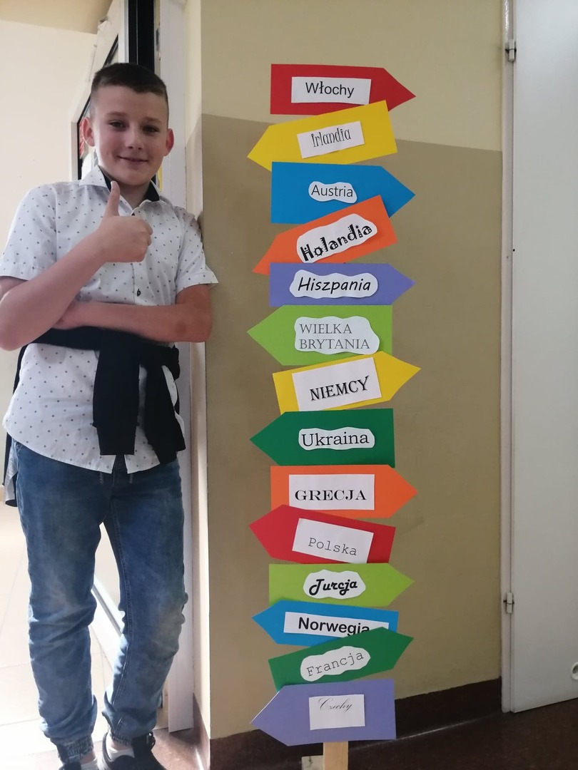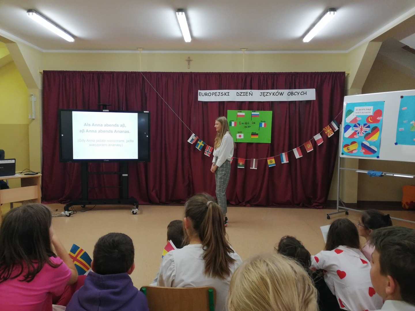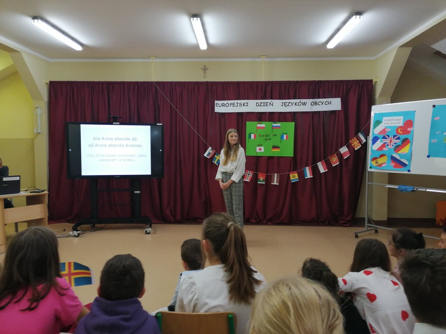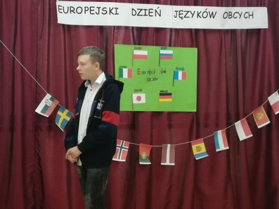 Najmłodsi uczniowie z klas 0-III w tym dniu witali się oraz żegnali w języku wybranego kraju. Z pomocą wychowawców wykonali oni również flagi tych krajów i dekoracje na drzwiach swoich klas. Prezentację najmłodszych uczniów można obejrzeć na filmiku poniżej.