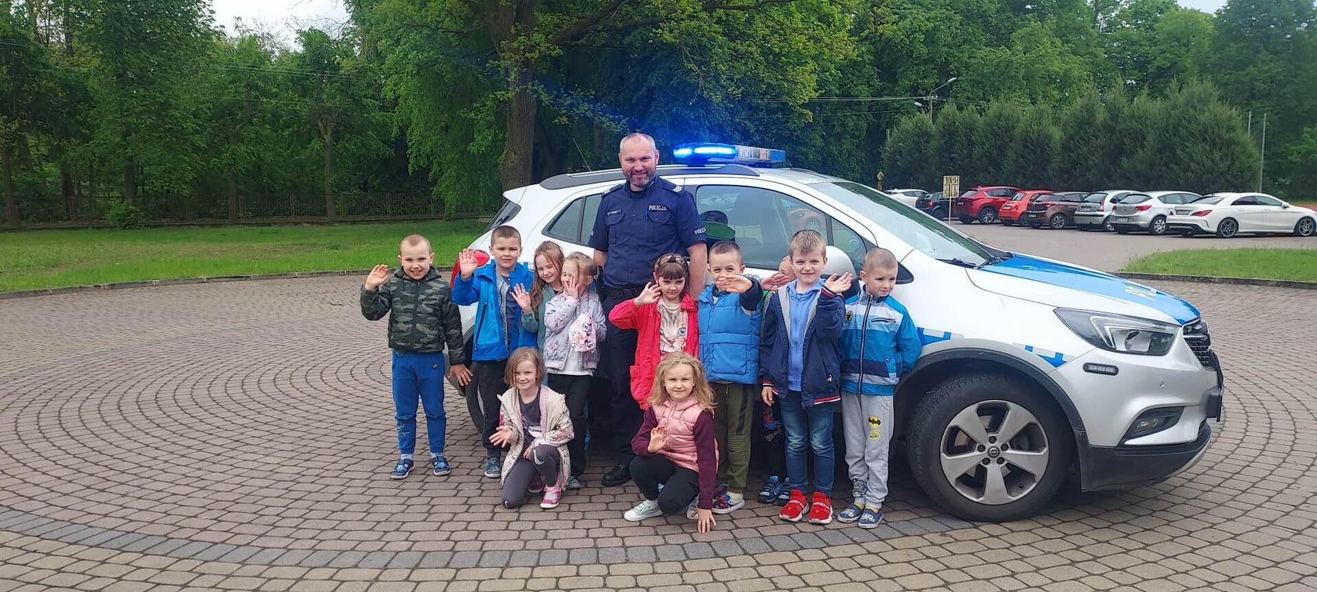 Gościliśmy także sierż. szt. pana Pawła Burcza, który w czasie spotkań z uczniami i przedszkolakami omawiał sytuacje niebezpieczne dla dzieci, ale także prezentował sposoby ich unikania.
