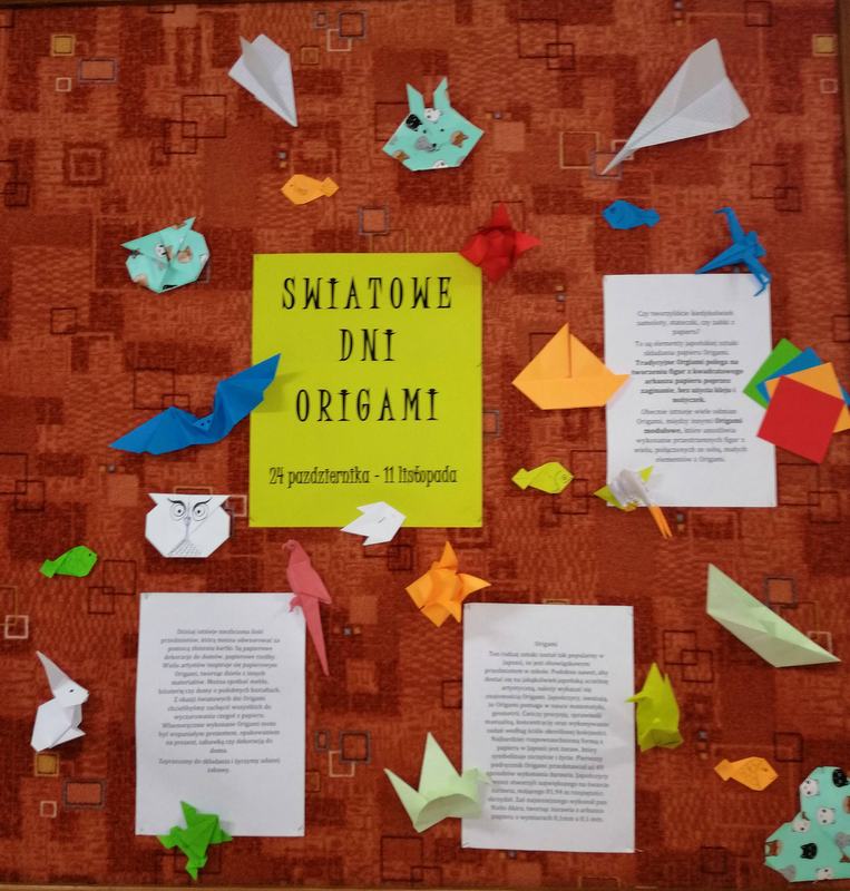 W dniach 24 października-11 listopada obchodziliśmy w naszej szkole Światowe Dni Origami. Origami to sztuka składania papieru bez użycia kleju i nożyczek.