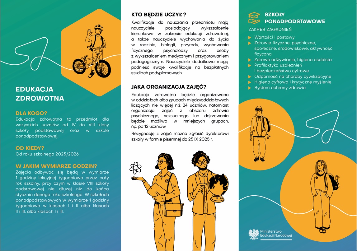 Edukacja zdrowotna ma na celu kształtowanie postaw prozdrowotnych, wzmacnianie świadomości wpływu stylu życia na zdrowie oraz przygotowanie dzieci i młodzieży do podejmowania odpowiedzialnych decyzji dotyczących własnego zdrowia we wszystkich jego wymiarach: fizycznym, psychicznym, społecznym, środowiskowym i cyfrowym. Wśród zadań Państwowej Inspekcji Sanitarnej jest inicjowanie i wspieranie wszelkich przedsięwzięć zwiększających poziom bezpieczeństwa zdrowotnego społeczeństwa. Taką inicjatywą jest bez wątpienia nowy przedmiot - edukacja zdrowotna. Ponieważ decyzja o uczestnictwie dziecka w tych zajęciach zależy od rodziców lub opiekunów prawnych dziecka, ważne jest, aby rodzice byli dobrze poinformowani na czym polega nowy przedmiot i jakie korzyści przynosi ich dzieciom. Ministerstwo Edukacji Narodowej przygotowało kompleksową kampanię informacyjną, w ramach której zostały udostępnione liczne materiały dla nauczycieli oraz ulotka informacyjna skierowana do rodziców. Te zasoby, https://www.gov.pl/web/edukacja/edukacja-zdrowotna dostępne oraz na na stronie platformie MEN: ZPE: https://zpe.gov.pl/edukacja-zdrowotna, obejmują programy nauczania, scenariusze lekcji, poradniki i inne pomocne publikacje, które wspierają profesjonalne prowadzenie zajęć. Zachęcamy nauczycieli i rodziców do aktywnego korzystania z tych materiałów, które umożliwiają przygotowanie uczniów i sprzyjają skutecznej realizacji nowego przedmiotu. Deklaracje rezygnacji z przedmiotu składane są do 25 września 2025 r.