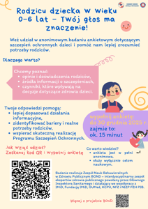 zapraszamy rodziców i opiekunów dzieci w wieku 0–6 lat do udziału w anonimowym badaniu naukowym dotyczącym Powszechnych Szczepień Ochronnych (PSO).